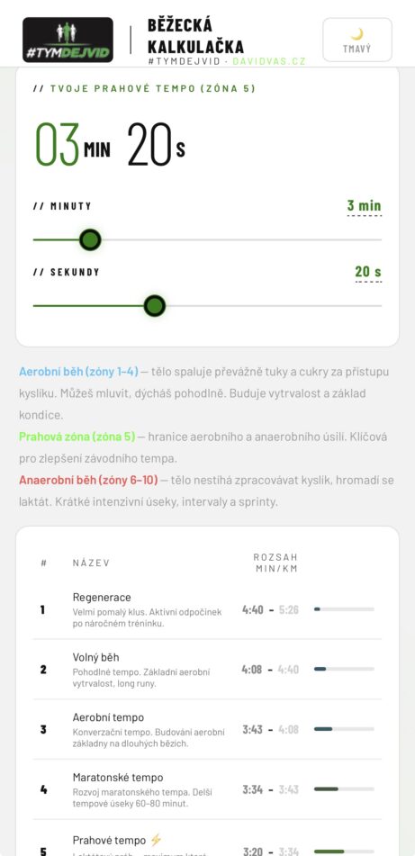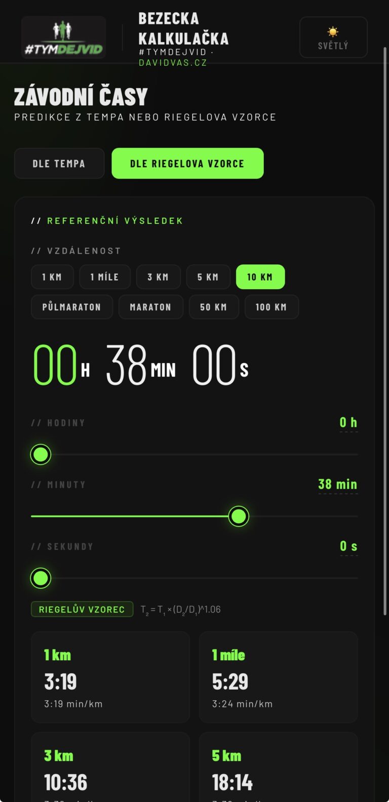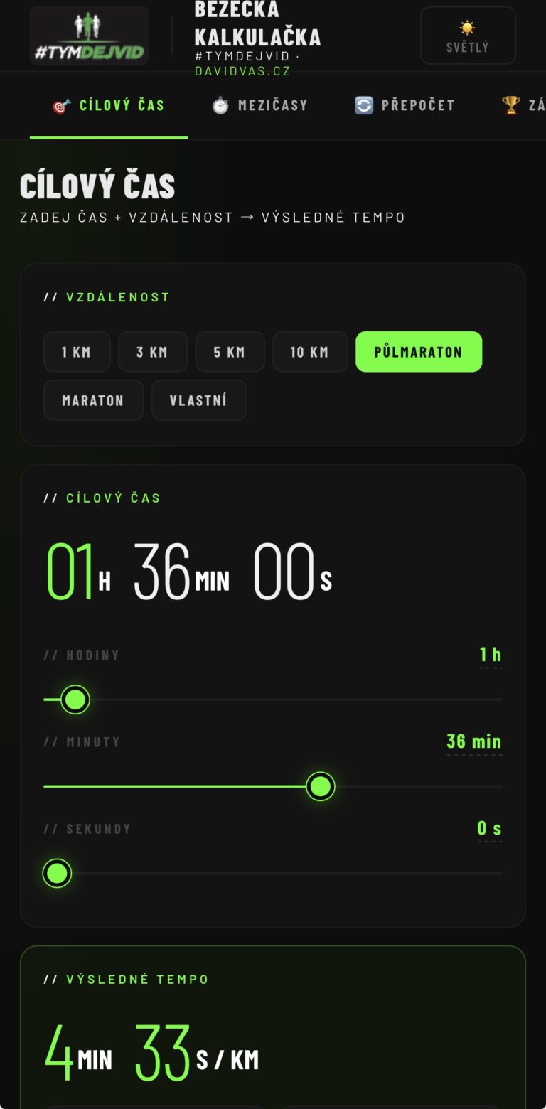 Něco co jsem hledal dlouhá letá a jsem rád, že díky dnešním technologiím je možnost si svojí aplikaci vytvořit. Běžecká kalkulačka v kapse. Mezičasy, zóny, závodní predikce a negativní splity — vše na míru tvému tempu.
