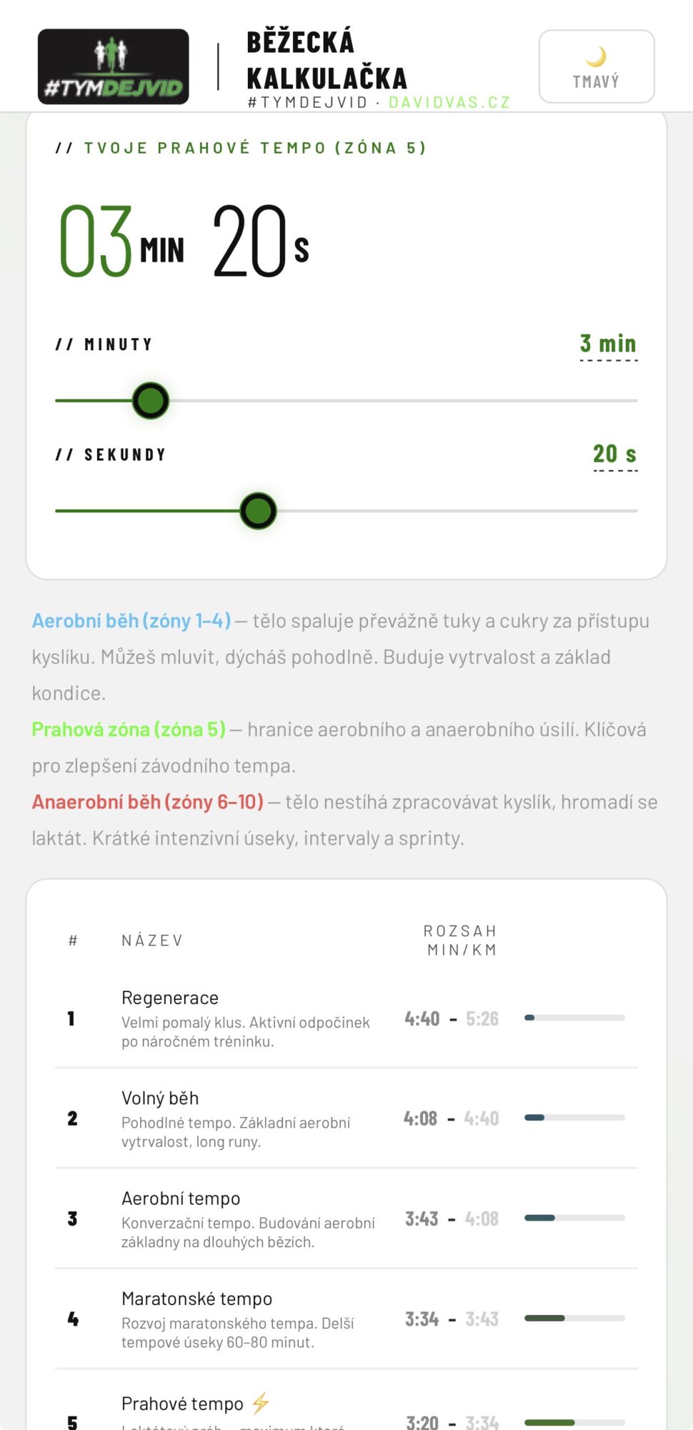 Zadáš prahové tempo a dostaneš 10 tréninkových zón přesně pro tebe. S vysvětlením k čemu každá slouží.