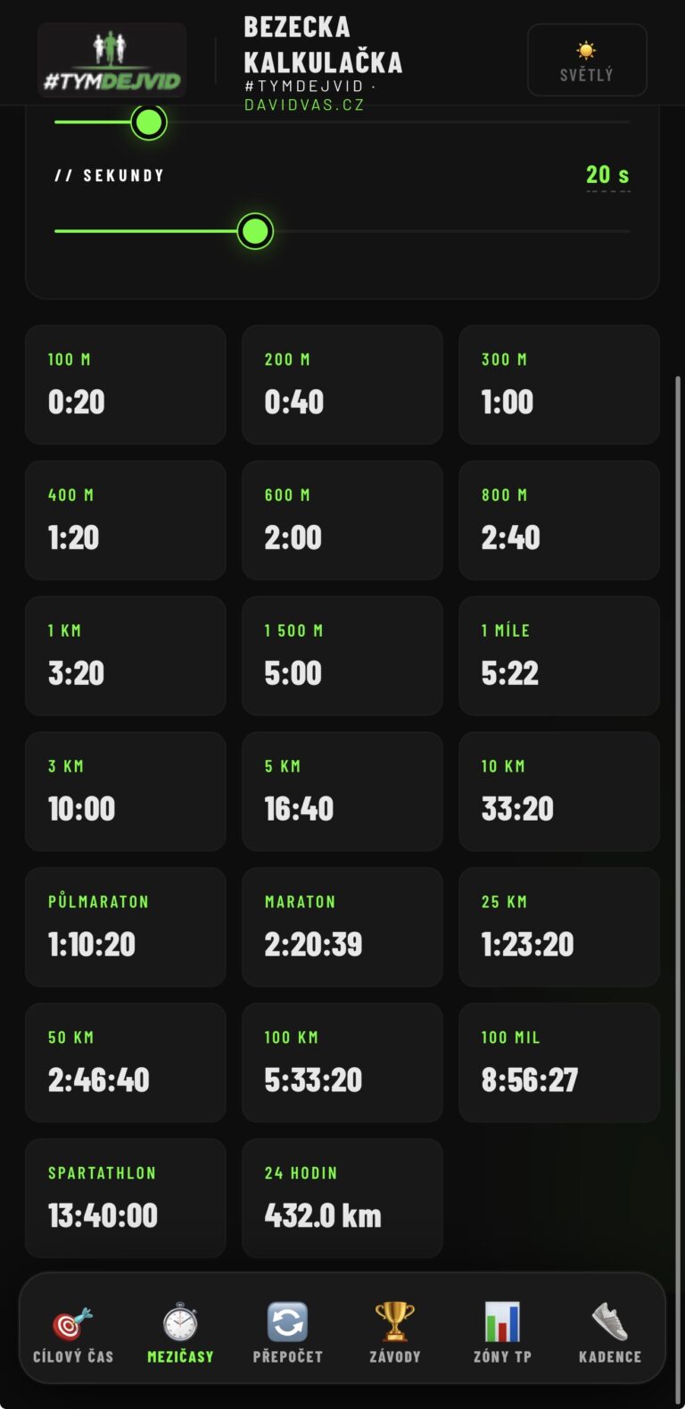 Tempo na kilometr a k tomu mezičasy od 100 m po 24hodinový závod.