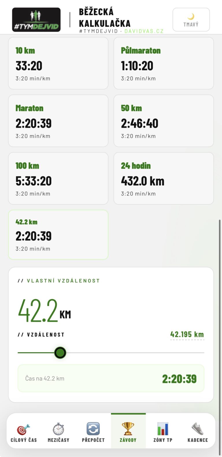 Zadáš vzdálenost a cíl — okamžitě víš jaké tempo musíš držet. Funguje i pro maraton, půlku i vlastní vzdálenost. + negative/positive split