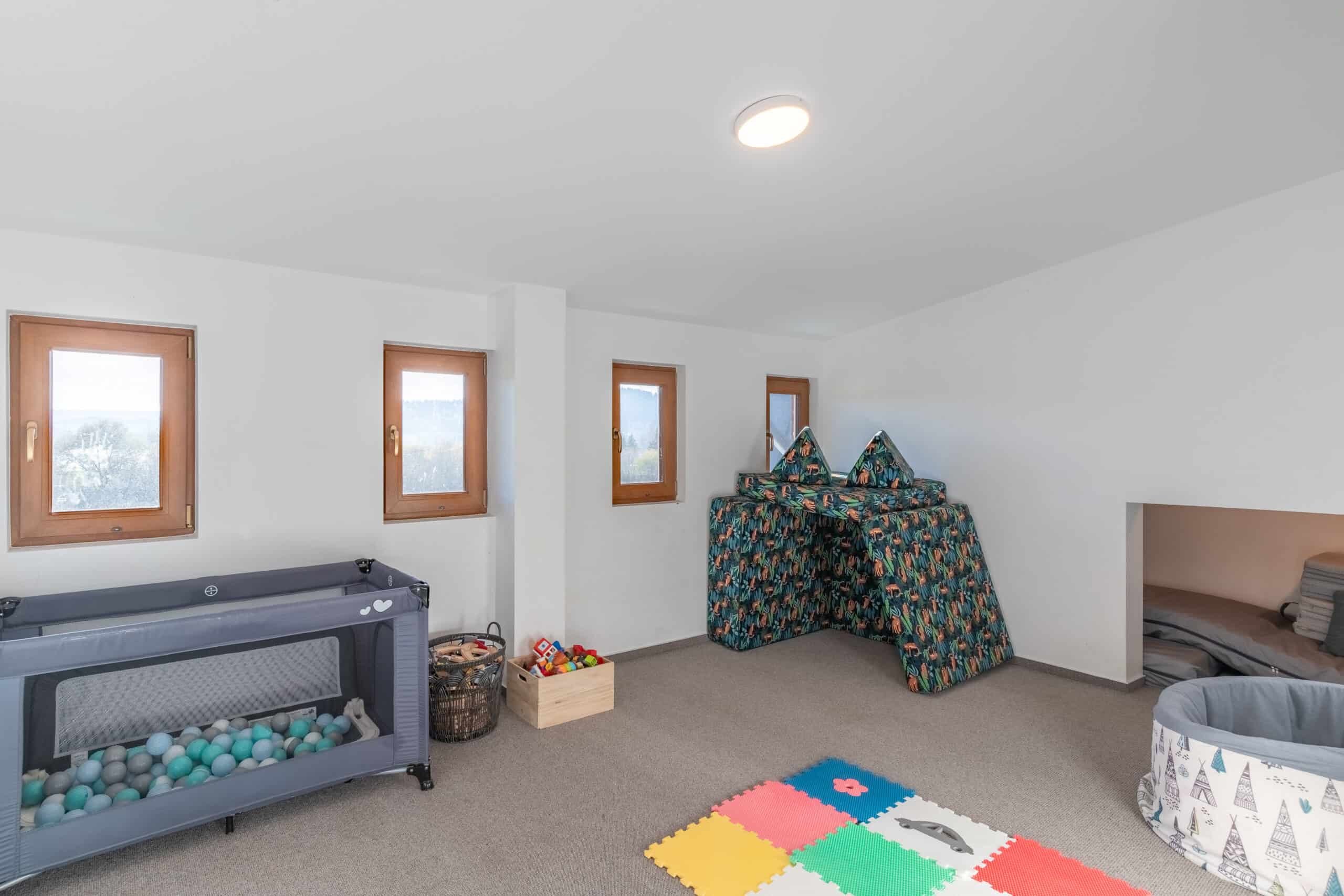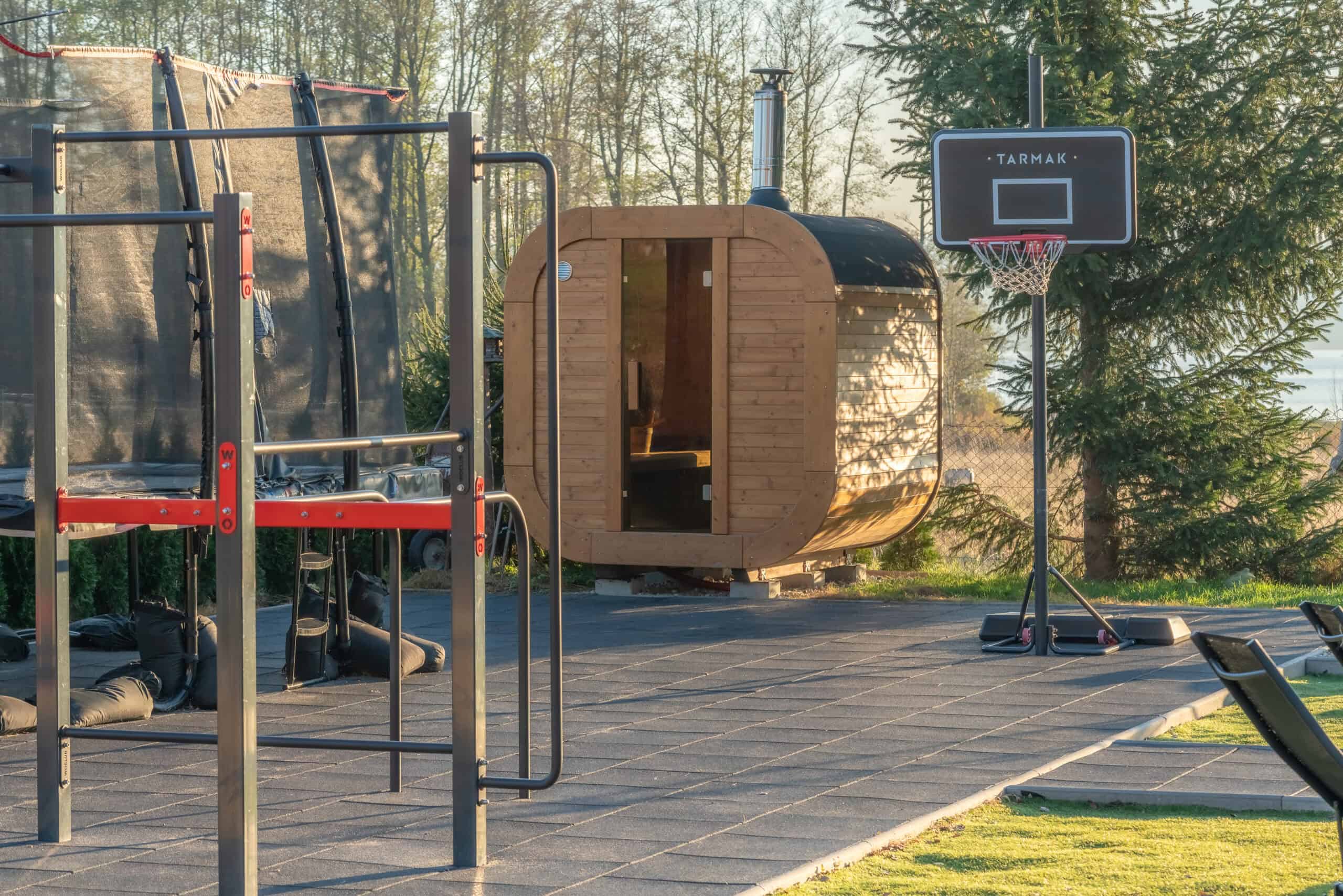 Na zahradě hned u terasy se nachází workoutové hřiště s dětskými prvky a profesionální trampolínou. Je zde také malá venkovní sauna na dřevo. Součástí je také vstup do venkovního uzamykatelného prostoru k uskladnění kol