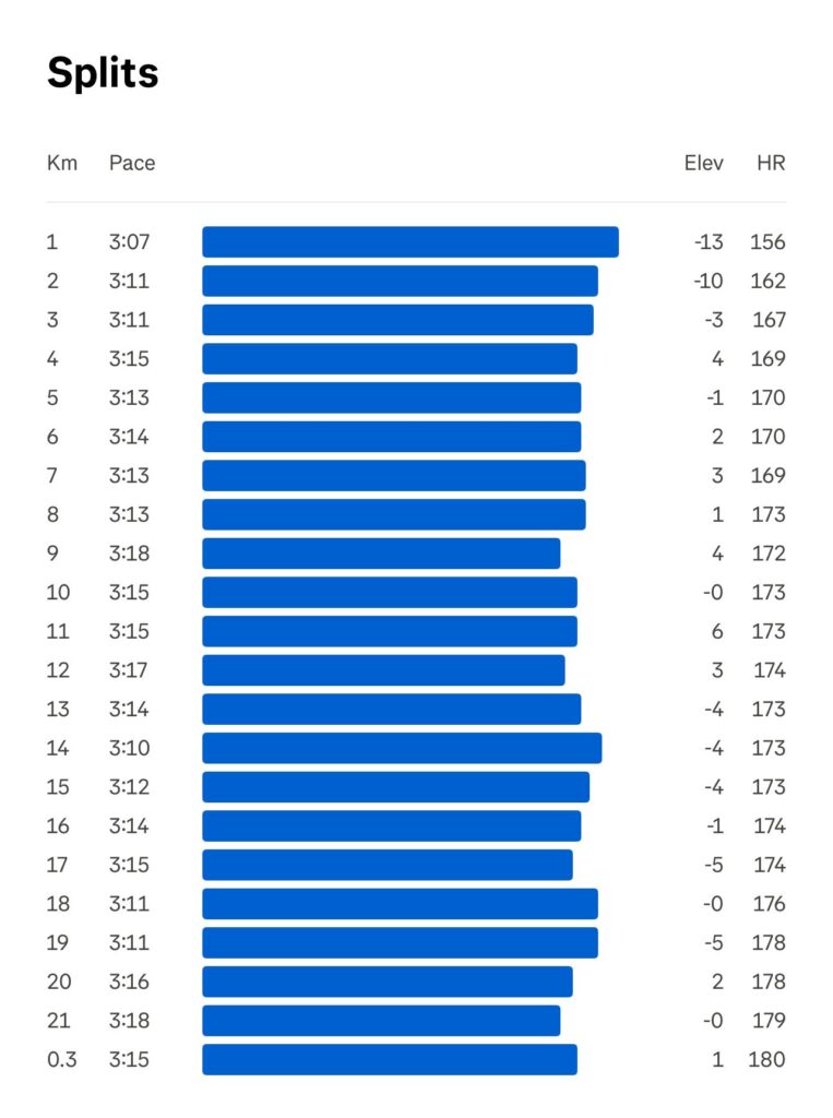 Měl jsem původně v plánu běžet kolem 3:18/km, ale v tu chvíli jsem si říkal: „Teď to běží, tak proč brzdit?“ 😅