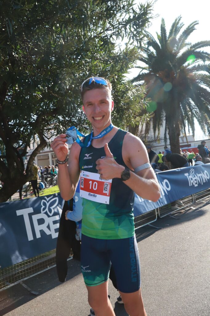 Po doběhu jsem dostal medaili, rozdal úsměvy a hurá do jezera – ochlazení nohou přímo v Gardě 🧊.