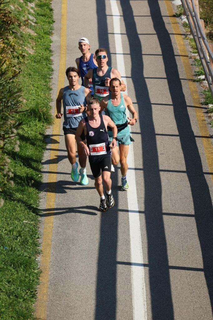 První úsek trasy z Rivy byl mírně z kopce, takže se tempo hned rozjelo. Už po pár minutách se začaly formovat skupinky – v čele samozřejmě Keňané, to je klasika 😄, za nimi další silní běžci a pak my – skupina osmi lidí, kteří jsme se postupně během závodu „třídili“, až nás zůstalo pět.
